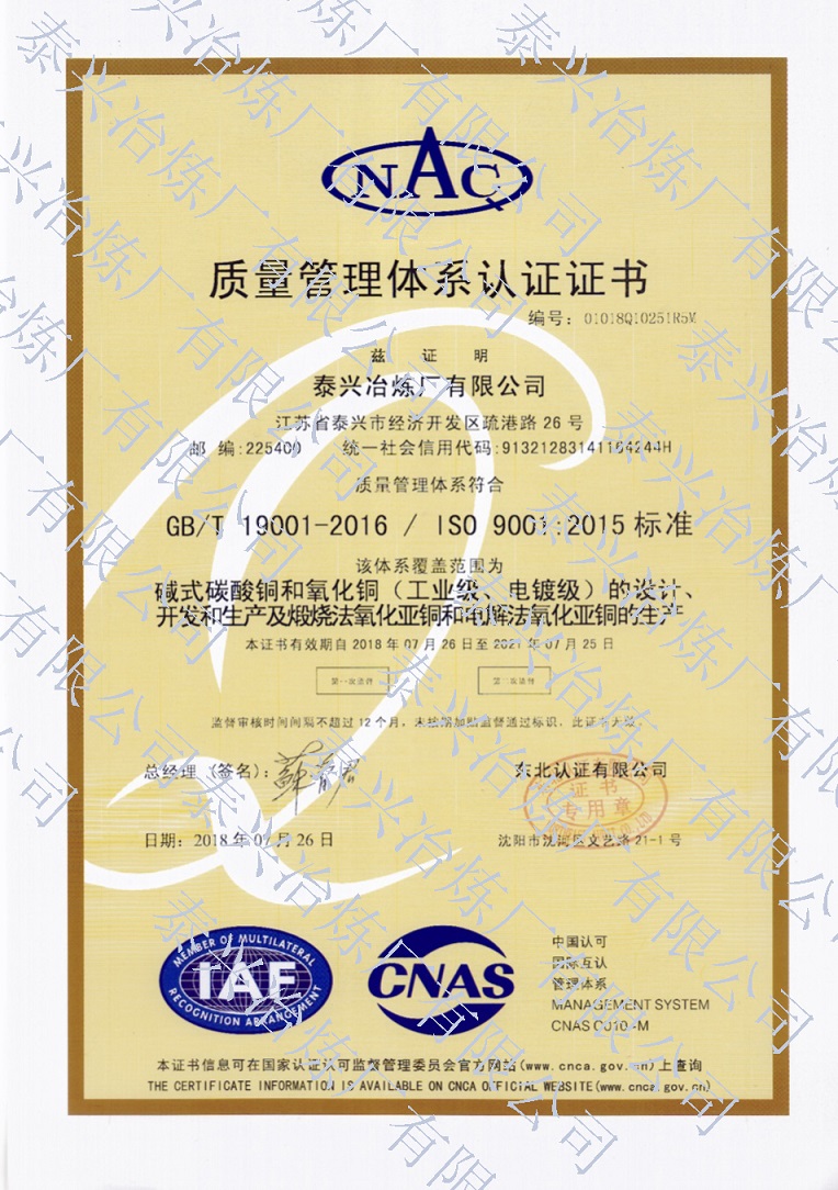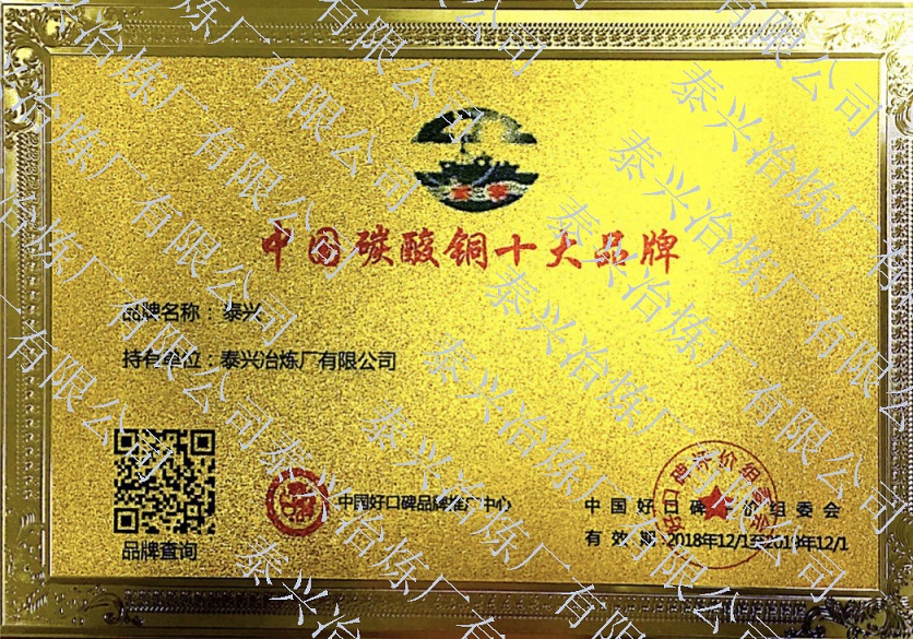 泰興冶煉廠有限公司(原泰興冶煉廠),始建于20世紀(jì)70年代初,現(xiàn)位于江蘇省泰興經(jīng)濟(jì)開發(fā)區(qū)。歷經(jīng)40年的創(chuàng)新驅(qū)動(dòng)、穩(wěn)健發(fā)展,已成長為一家專業(yè)生產(chǎn)堿式碳酸銅、高純電鍍氧化銅、氧化亞銅、氧化銅、無水硫酸銅、海綿銅粉及副產(chǎn)品聚氯化鋁(凈水劑)等系列無機(jī)鹽產(chǎn)品及處置不含氨的氯化銅蝕刻液(HW22)15000噸/年的“國家高新技術(shù)企業(yè)”和地方性骨干企業(yè)。公司總占地面積3.7萬平方米,建筑面積4萬平方米,注冊資本2088萬元,固定資產(chǎn)1.2億元,年產(chǎn)值約7億元。